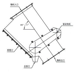 由管道體、驅(qū)動裝置、磁體運行裝置三大部分組成,驅(qū)動裝置安裝在管道壁上,通過鏈輪、鏈條帶動管道體內(nèi)磁分離腔的磁體運行裝置運轉(zhuǎn),永磁體將管道內(nèi)物料中混雜的鐵磁性物質(zhì)通過出鐵口排出管道外。